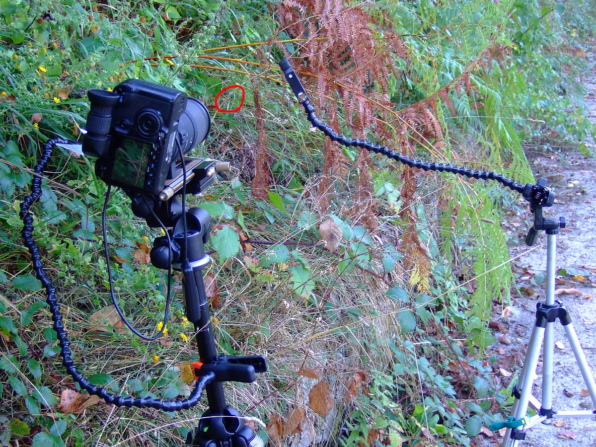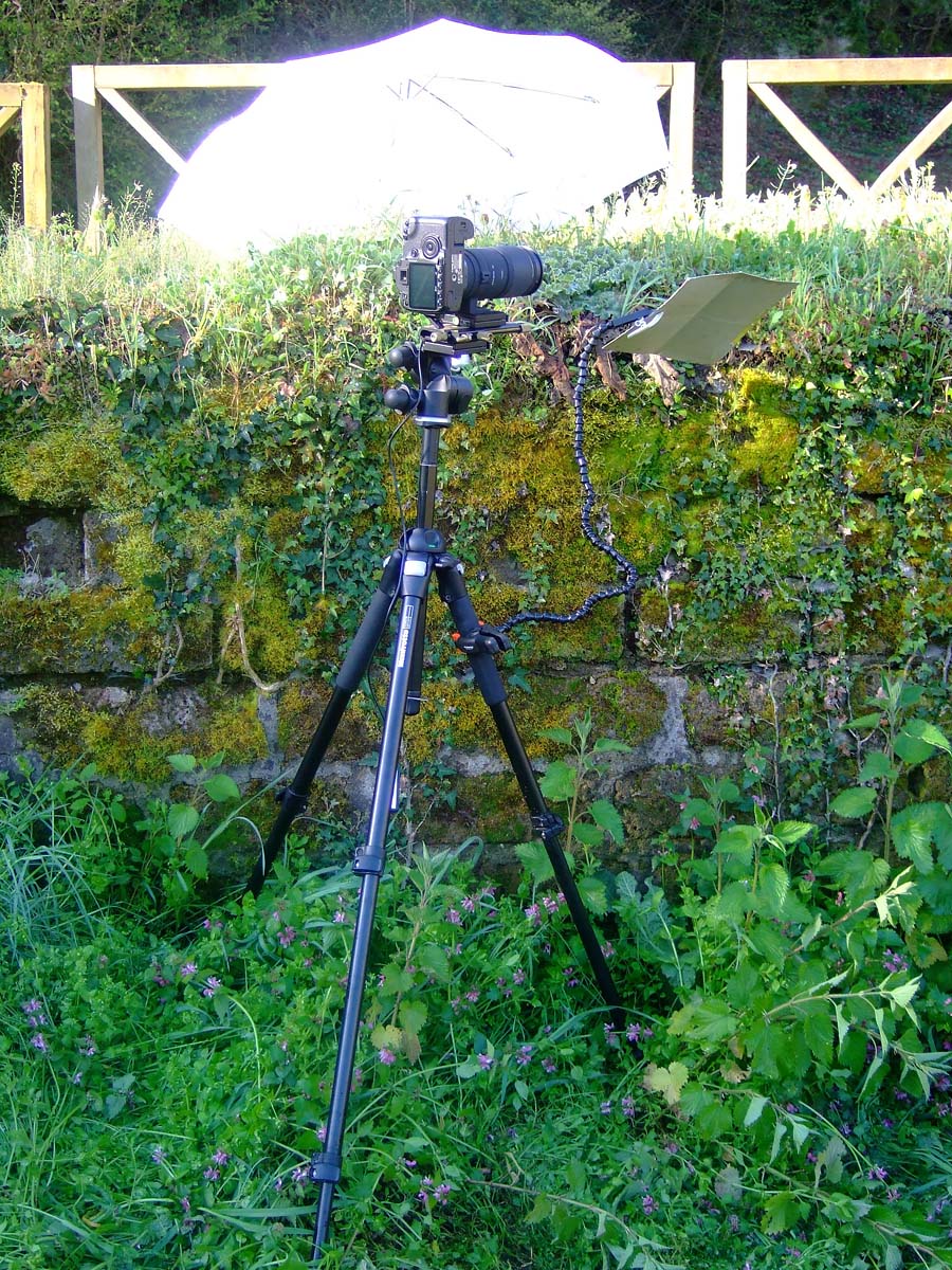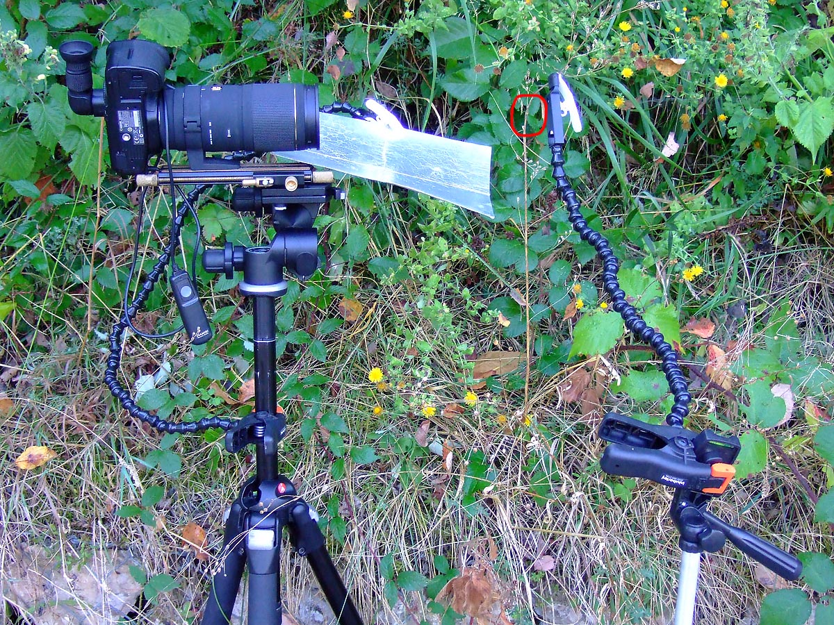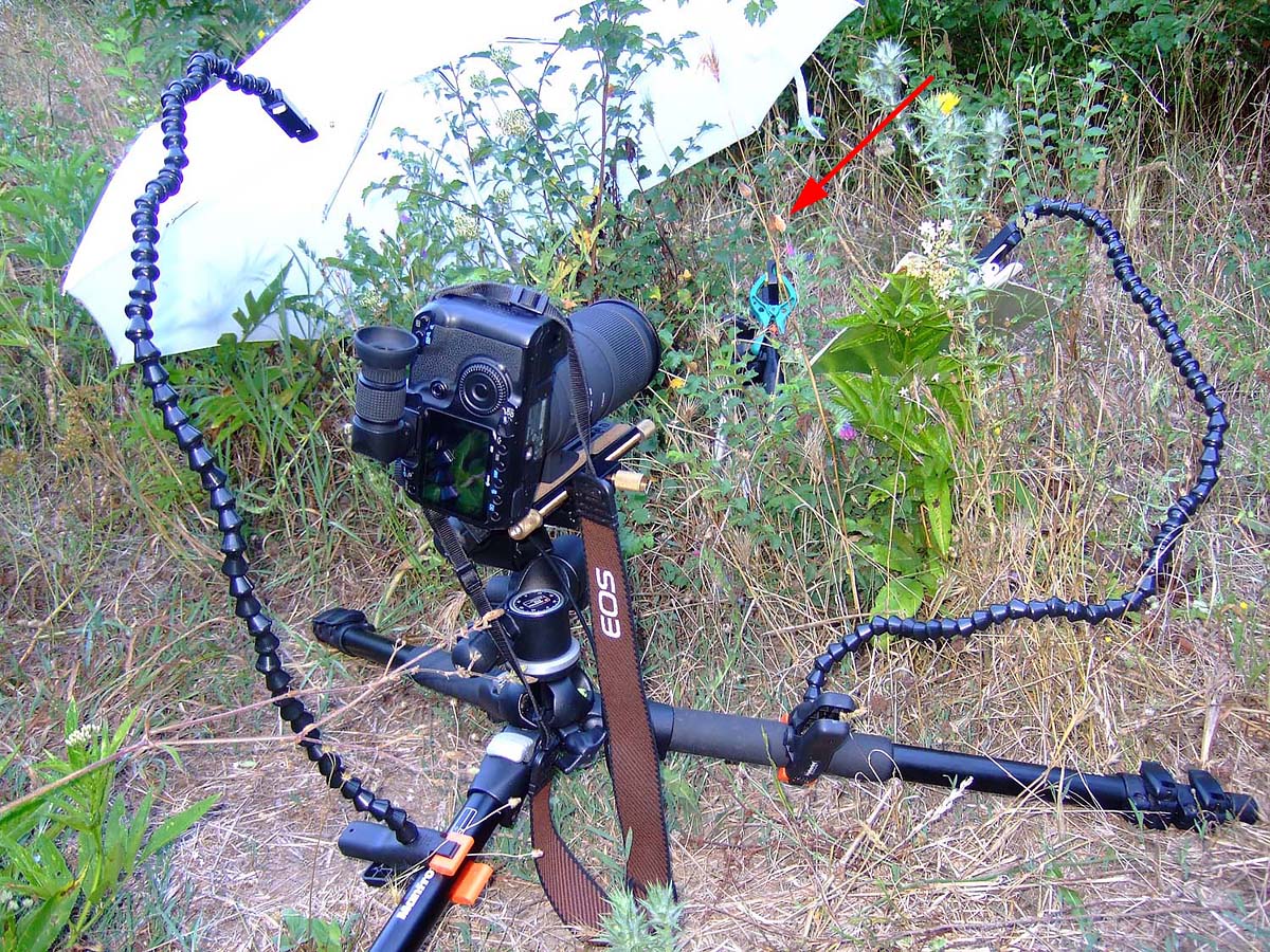 Spesso è più facile tagliare lo stelo dove riposa il soggetto e fissarlo su un cavallettino, spostando poi il tutto dove lo sfondo ci è più congeniale, ma a volte questi soggetti cadono dal loro posatoio alla minima vibrazione e non è più possibile riposizionarli. Quindi prima si prova a riprenderli nella posizione originale, come in questo caso, dove il cavalletto ad apertura totale delle gambe mi permette di posizionarlo più basso possibile. In questa posizione diventa scomodissimo guardare nel mirino o nello schermo liveview, quindi un accessorio che io consiglio è il mirino angolare che permette un agevole visione senza spezzarsi la schiena.